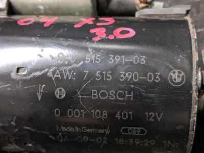 Quick view Bosch BMW E83 X3 Starter Motor Bosch 0001108401 12417515390 $79.99 BMW E83 X3 Starter Motor Bosch 0001108401 12417515390. 1.4 KW. Bosch part number 0001108401. Shows wear from use such as scratches and scuffs. Some corrosion on the item. Working when removed... Add to Cart Add to Cart