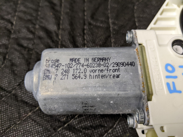 BMW F10/F11 5-Series Power Window Drive Motor Right 51337248172. 51337271564. Shows wear from use such as scratches and scuffs. Use part number to determine fitment. Working when removed. Removed from parts vehicle. Please see photos for more detail. Photos are stock photos and representative of the condition of the item. The item you receive may have variations to the appearance compared to the photos shown. If you would like to see the specific item you will receive, please contact us prior to purchase. Free shipping to the lower 48 United States. Returned items are subject to a 20% restocking fee for any non-defective items.